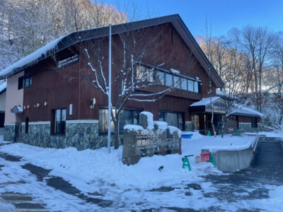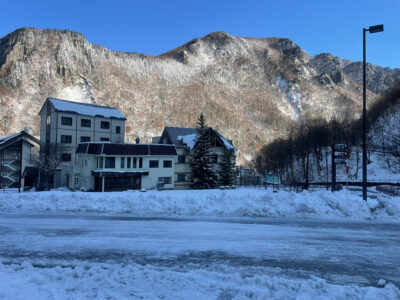 今朝の層雲峡の最低気温は-2℃でした。写真のように路面は積雪かつ凍結しています。車の走行には冬タイヤが必要になりますが、歩道を歩く際にも転倒に注意が必要です。