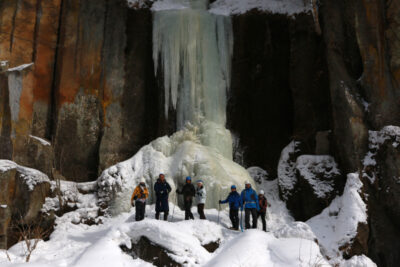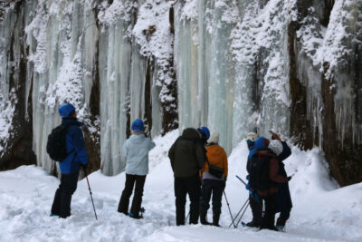 きょうから始まった冬季観察会では川面に張った霜の華(フロストフラワー)が観察され、氷柱や氷瀑とともに厳冬期ならではの景色に、参加者のシャッター音が響いていました。